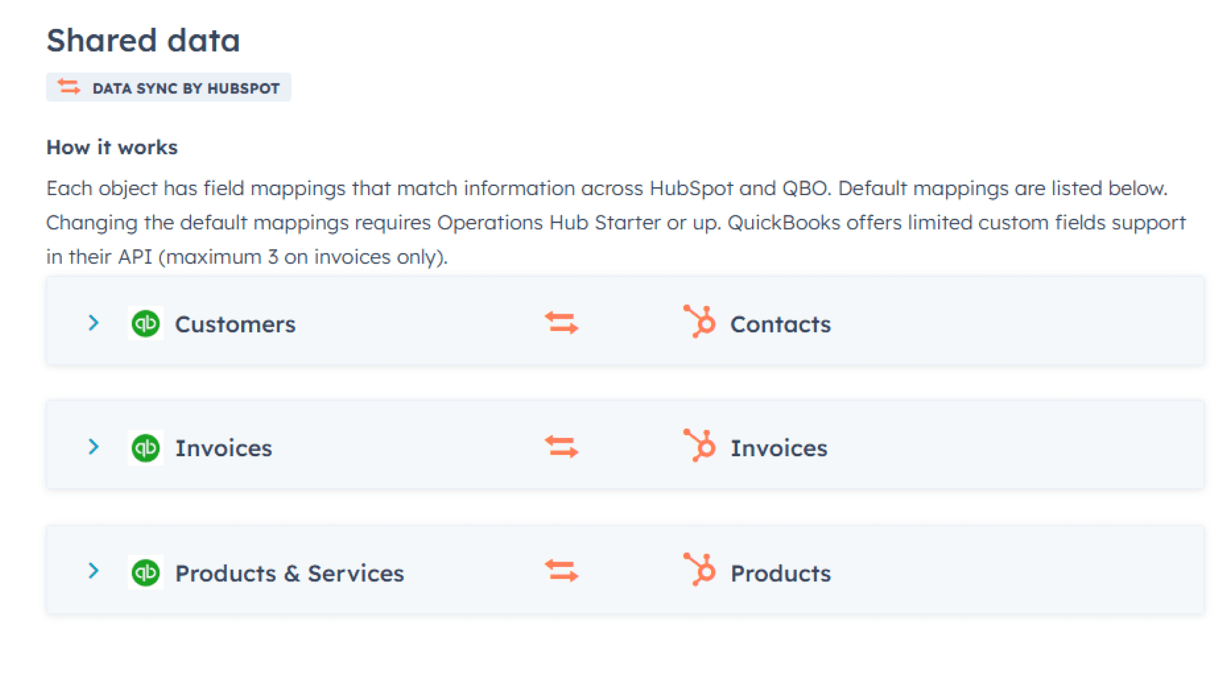 The native integration between HubSpot and QuickBooks, available in the HubSpot Marketplace, syncs several data points: