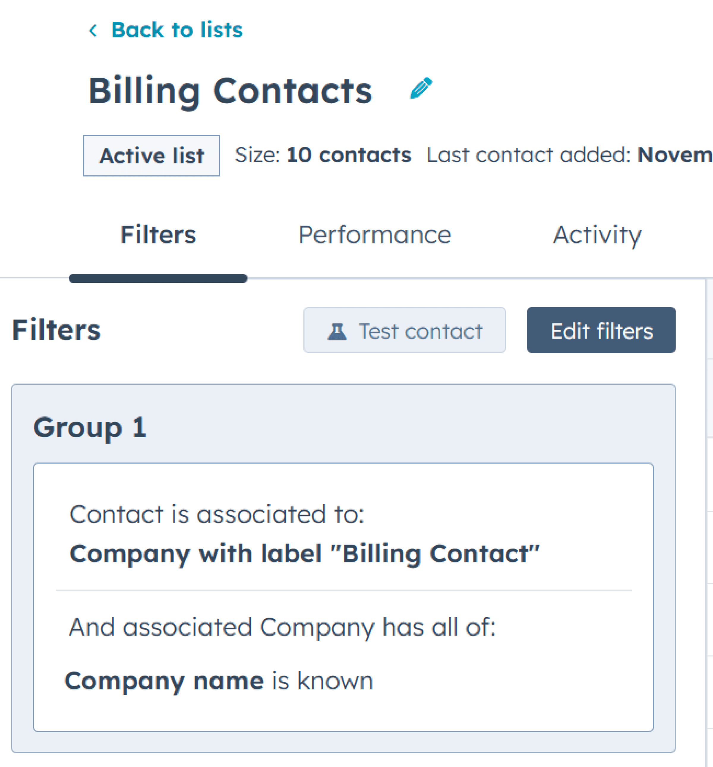 Create a list in HubSpot for all contacts associated with the billing label.